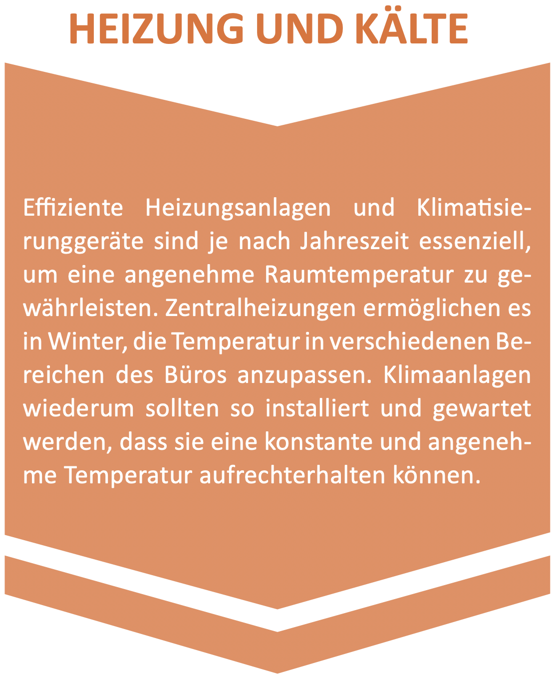 Eine produktive Arbeitsumgebung wird nicht nur durch die Raumaufteilung und die technische Infrastruktur bestimmt, sondern setzt auch gewisse Standards in Bezug auf die Raumtemperatur, Luftqualität und Sanitäranlagen voraus. Deshalb ist es wichtig, effiziente Heizungs-, Kälte- und Lüftungsanlagen zu installieren, die an die jeweilige Gebäudestruktur und Personenanzahl angepasst werden. Hier stehen wir Ihnen mit diversen Dienstleistungen jederzeit gerne zur Seite.