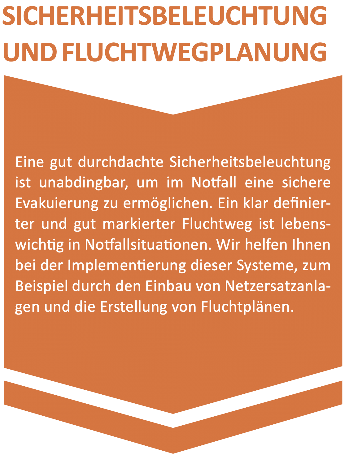 Die Sicherheit spielt neben gestalterischen Gesichtspunkten eine tragende Rolle in unseren Überlegungen. Wir sorgen für die verlässliche Einhaltung sämtlicher gesetzlicher Verpflichtungen im Brandschutz durch die Installation geeigneter Sicherheitssysteme und gewährleisten somit den Schutz von Leben und Sachwerten im Notfall. Der Werterhalt ist darüber hinaus für unsere Kunden von zentraler Bedeutung. Deshalb wird unser Angebot durch diverse Wartungs- und Instandhaltungsdienstleistungen bis hin zum laufenden Gebäudemanagement abgerundet. Gerne unterstützen wir Sie zudem mit unserem Projektmanagement und weiteren Dienstleistungen oder stellen eine Verbindung zu unserem Partnerunternehmen, Asset Solution AG, her.